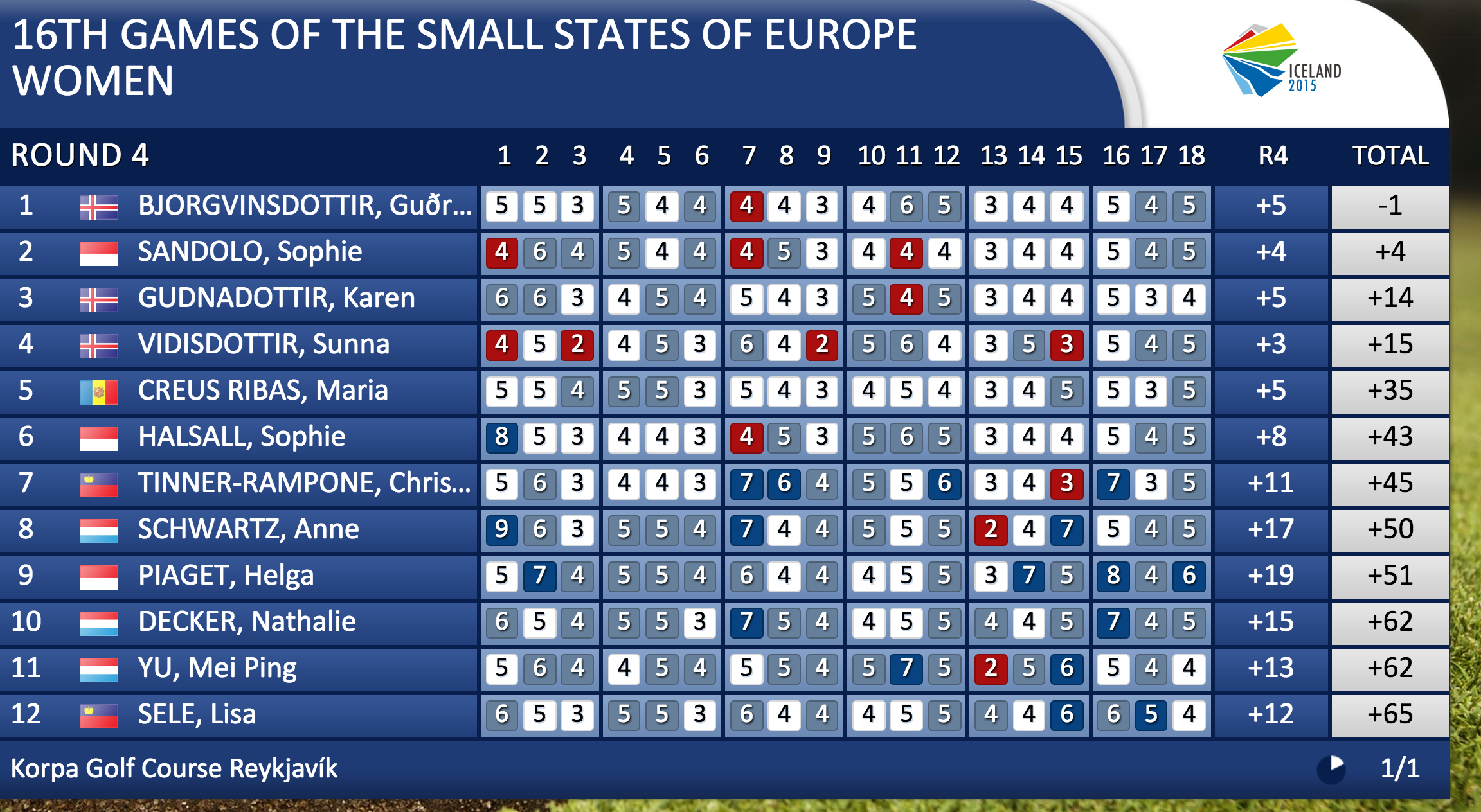Íslenska kvennalandsliðið tryggði sér yfirburða sigur á Smáþjóðaleikunum í golfi sem lauk í dag á Korpúlfsstaðavelli í Reykjavík. Guðrún Brá Björgvinsdóttir sigraði í einstaklingskeppninni – en hún lék á -1 samtals og var þremur höggum betri en Sophie Sandolo frá Mónakó. Karen Guðnadóttir varð þriðja á +14 samtals og Sunna Víðisdóttir varð fjórða á +15 samtals. Ísland lék samtals á +8 og sigraði með 33 högg mun en Mónakó varð í öðru sæti á +41 samtals, og Lúxemborg varð í þriðja sæti á +101 samtals.